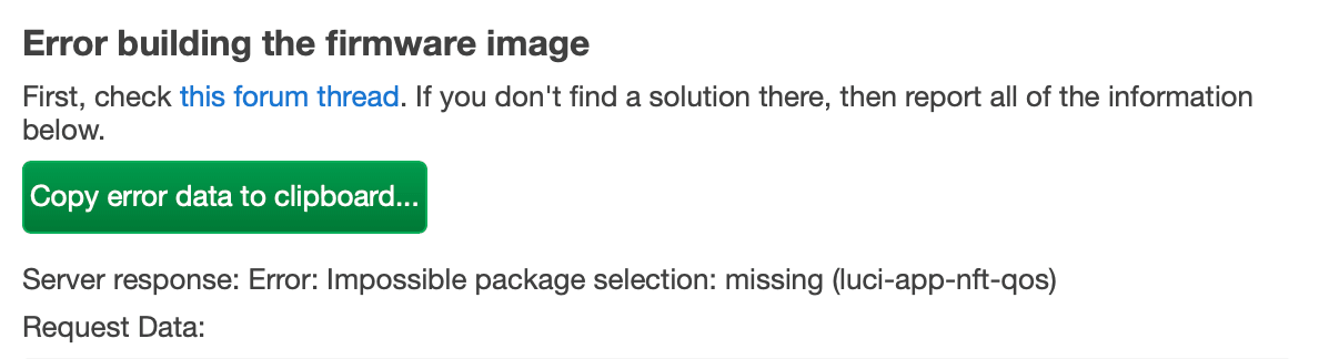 Na ekranie błędu zobaczysz na przykład, że pakiet (luci-app-nft-qos), który jest dostępny w repozytorium 24.10.x, nie jest jeszcze gotowy dla wersji 25.12.x.