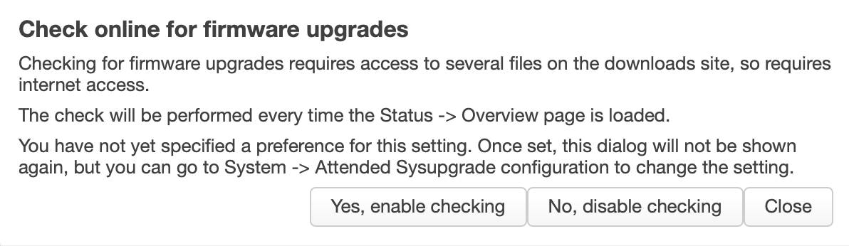 Jeśli po raz pierwszy zaktualizowałeś system do wersji 25.12.0 i zalogujesz się ponownie do panelu LuCI, przywita Cię pytanie o to, czy chcesz automatycznie sprawdzać dostępność nowych wersji oprogramowania.